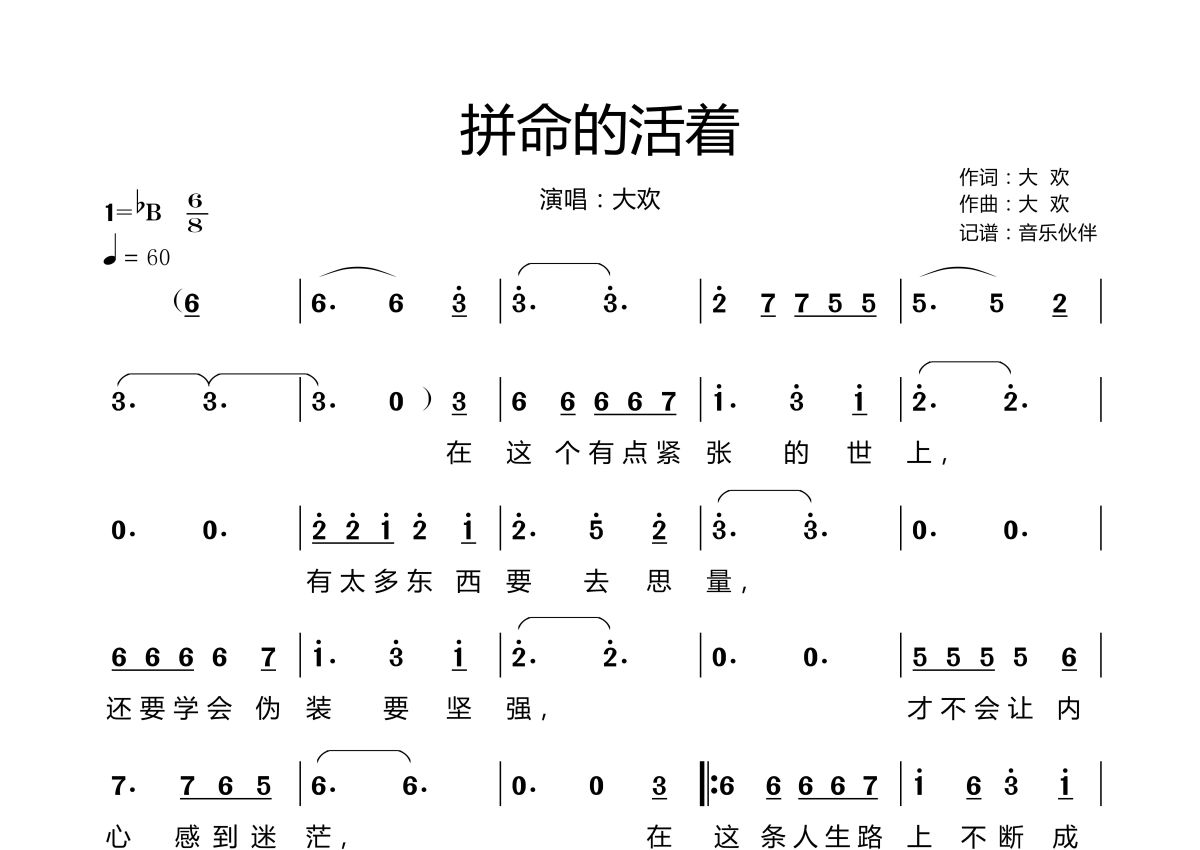 曲谱介绍: 大欢《拼命的活着》,音乐伙伴编配出品,共有2张高清图谱,免翻页排版设计。