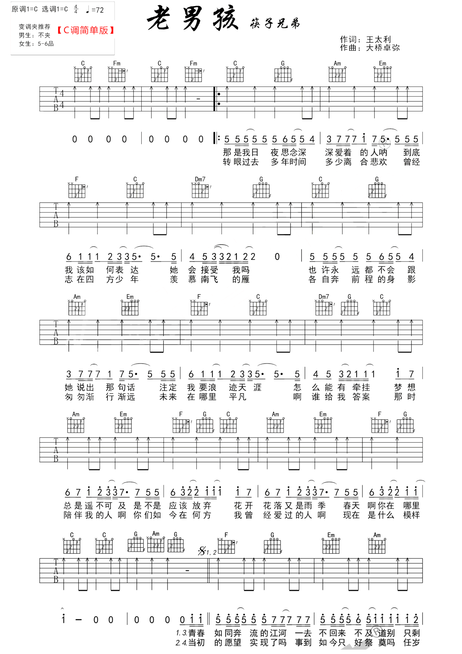曲谱介绍: 老男孩吉他谱,筷子兄弟演唱,王太利作词,大桥卓弥作曲,老男孩吉他弹唱谱,C调指法简单版,男生不夹变调夹,女生变调夹夹5到6品。 一首经典老歌,唱出了每个人内心的真实写照,就像一面镜子,照射出每个追梦人的模样,是青涩稚嫩还是世故苍老?相信我们都会被歌曲深深的触动。