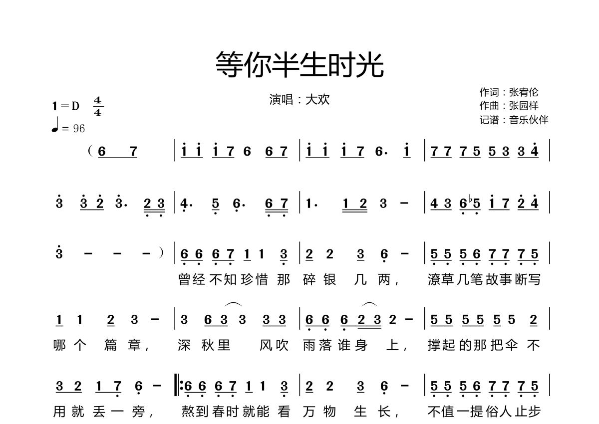曲谱介绍: 大欢《等你半生时光》,音乐伙伴编配出品,共有2张高清图谱,免翻页排版设计。