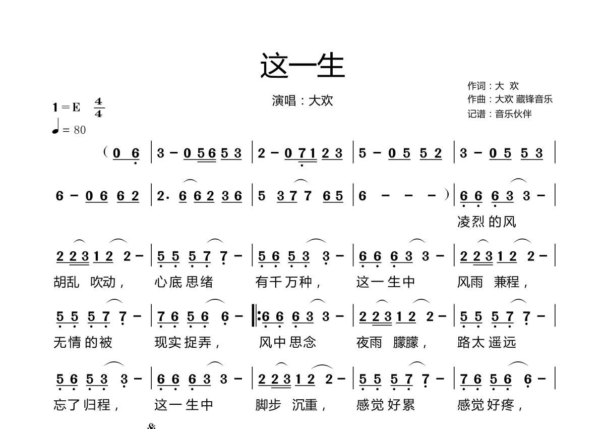 曲谱介绍: 大欢《这一生》,音乐伙伴编配出品,共有1张高清图谱,免翻页排版设计。