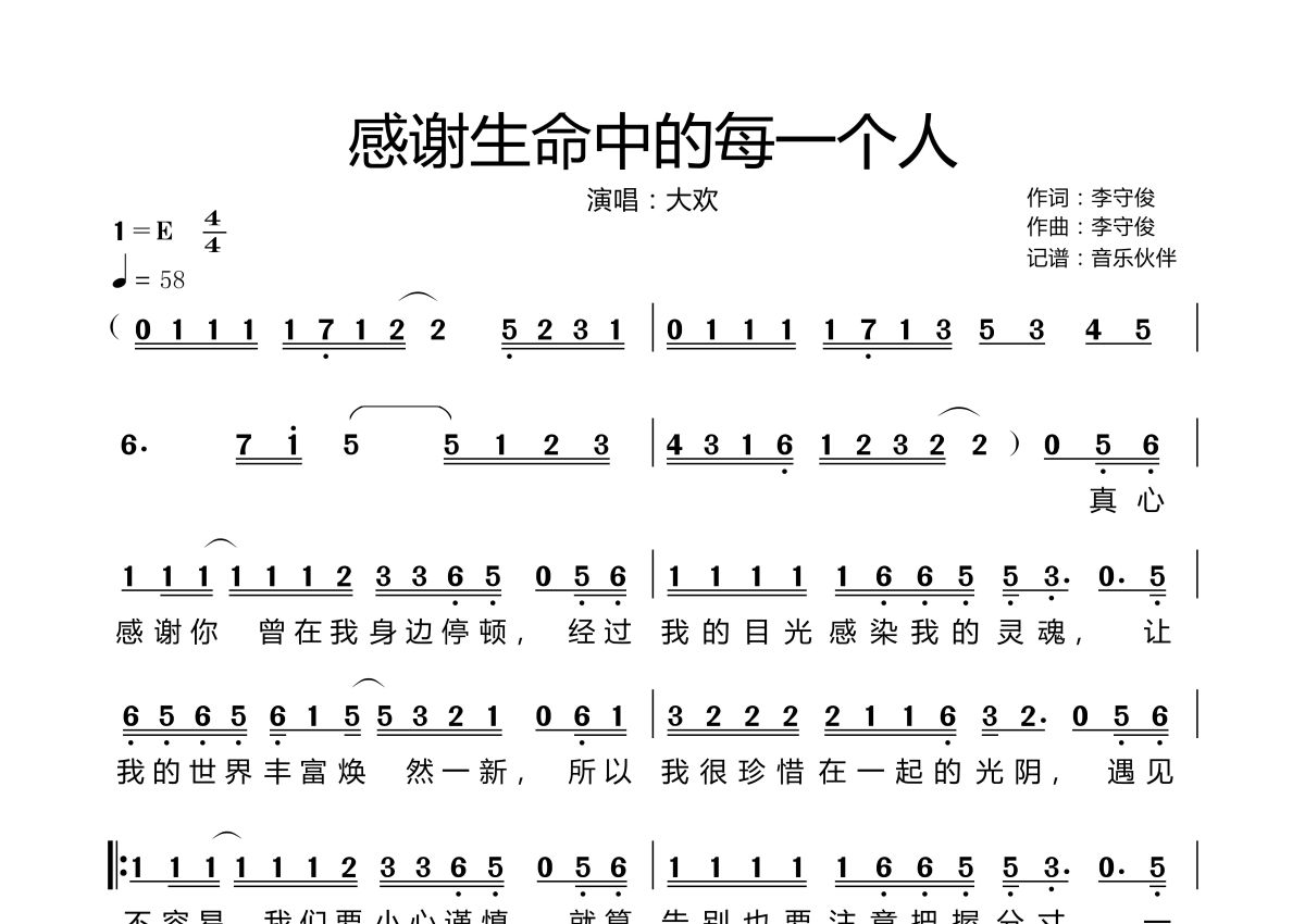 曲谱介绍: 大欢《感谢生命中的每一个人》,音乐伙伴编配出品,共有2张高清图谱,免翻页排版设计。