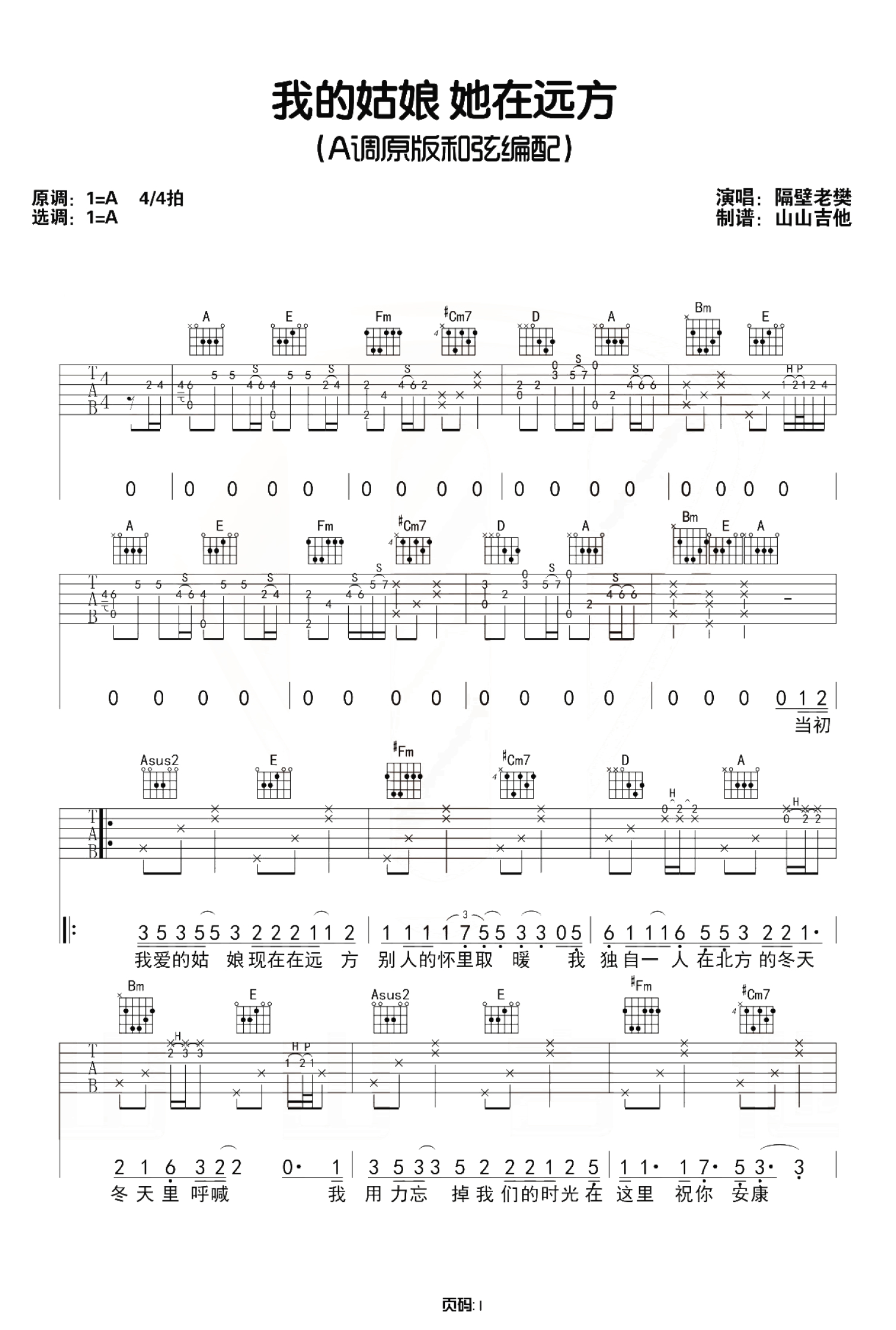 我的姑娘她在远方吉他谱 - 隔壁老樊 - A调吉他弹唱谱