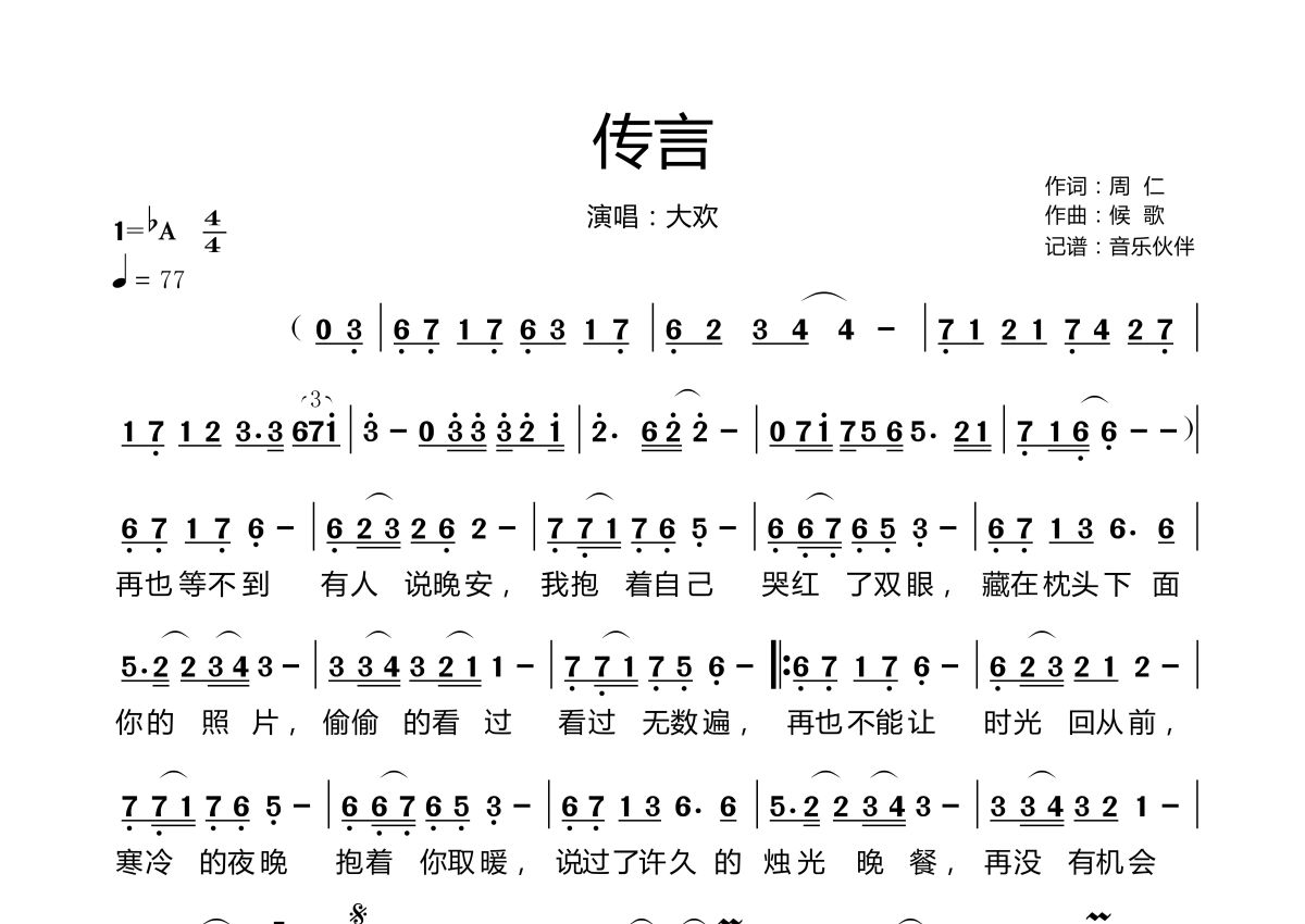 曲谱介绍: 大欢《传言》,音乐伙伴编配出品,共有1张高清图谱,免翻页排版设计。