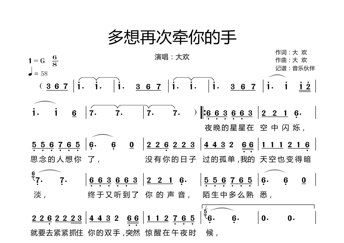 曲谱介绍: 大欢《多想再次牵你的手》,音乐伙伴编配出品,共有1张高清图谱,免翻页排版设计。