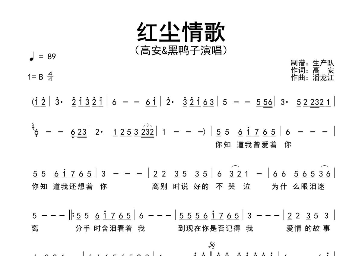 曲谱介绍: 高安&黑鸭子《红尘情歌》原版简谱,生产队编配出品,共有1张高清图谱,免翻页排版设计。