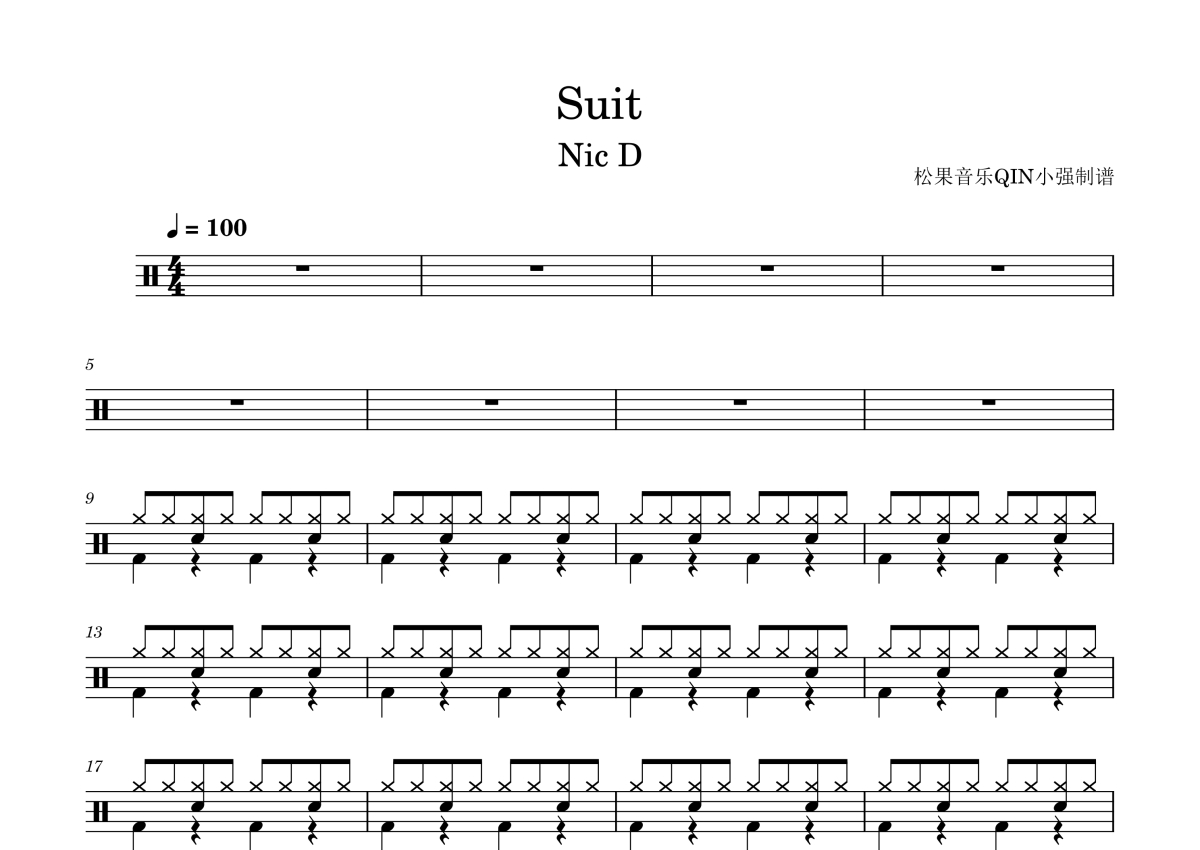 曲谱介绍: Nelly《suit》架子鼓谱,松果音乐QIN小强编配出品,共有2张高清图谱,免翻页排版设计。