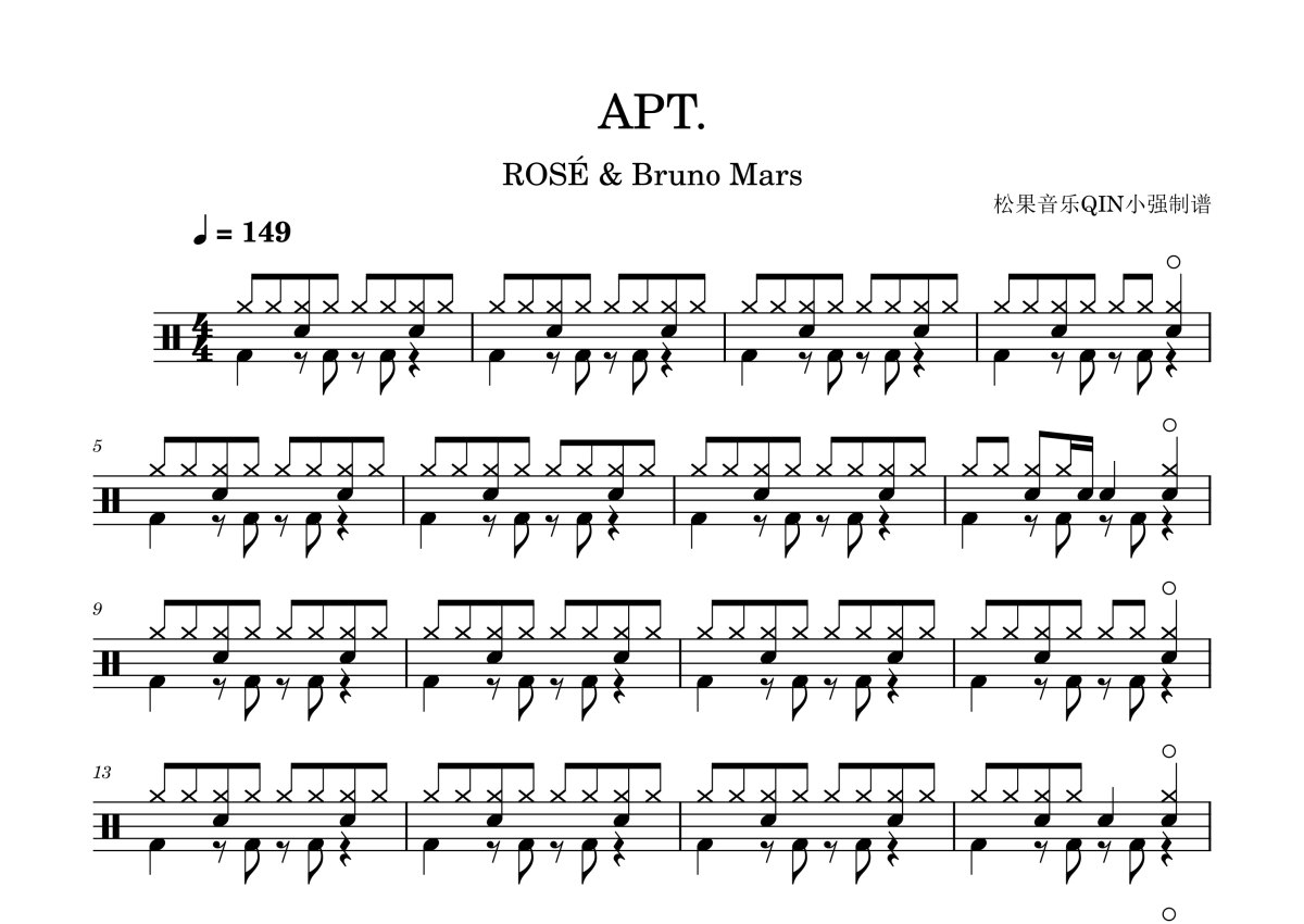 曲谱介绍: 朴彩英布鲁诺·马尔斯《APT.》架子鼓谱,松果音乐QIN小强编配出品,共有3张高清图谱。