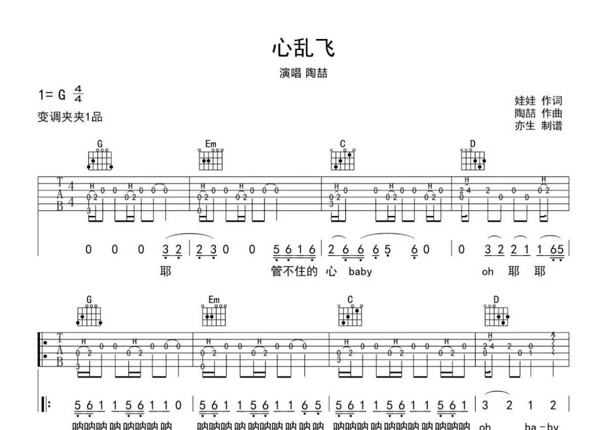 曲谱介绍: 陶喆《心乱飞》吉他弹唱谱,采用G调指法编配,亦生编配出品,共有3张高清图谱。