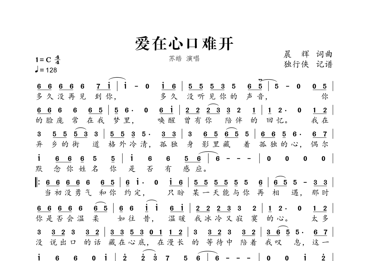 曲谱介绍: 苏皓《爱在心口难开》,独行侠编配出品,共有1张高清图谱,免翻页排版设计。