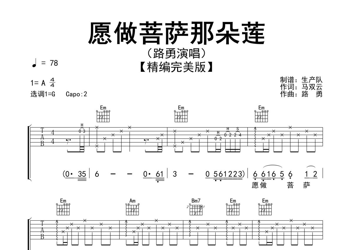 曲谱介绍: 路勇《愿做菩萨那朵莲》吉他弹唱谱,采用G调指法编配精编完美版,生产队编配出品,共有3张高清图谱。