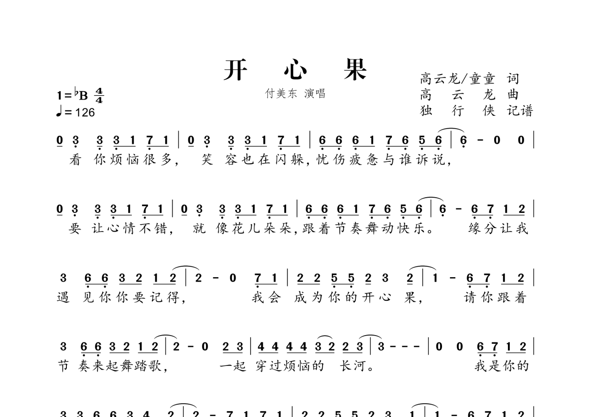 曲谱介绍: 付美东《开心果》,独行侠编配出品,共有1张高清图谱,免翻页排版设计。