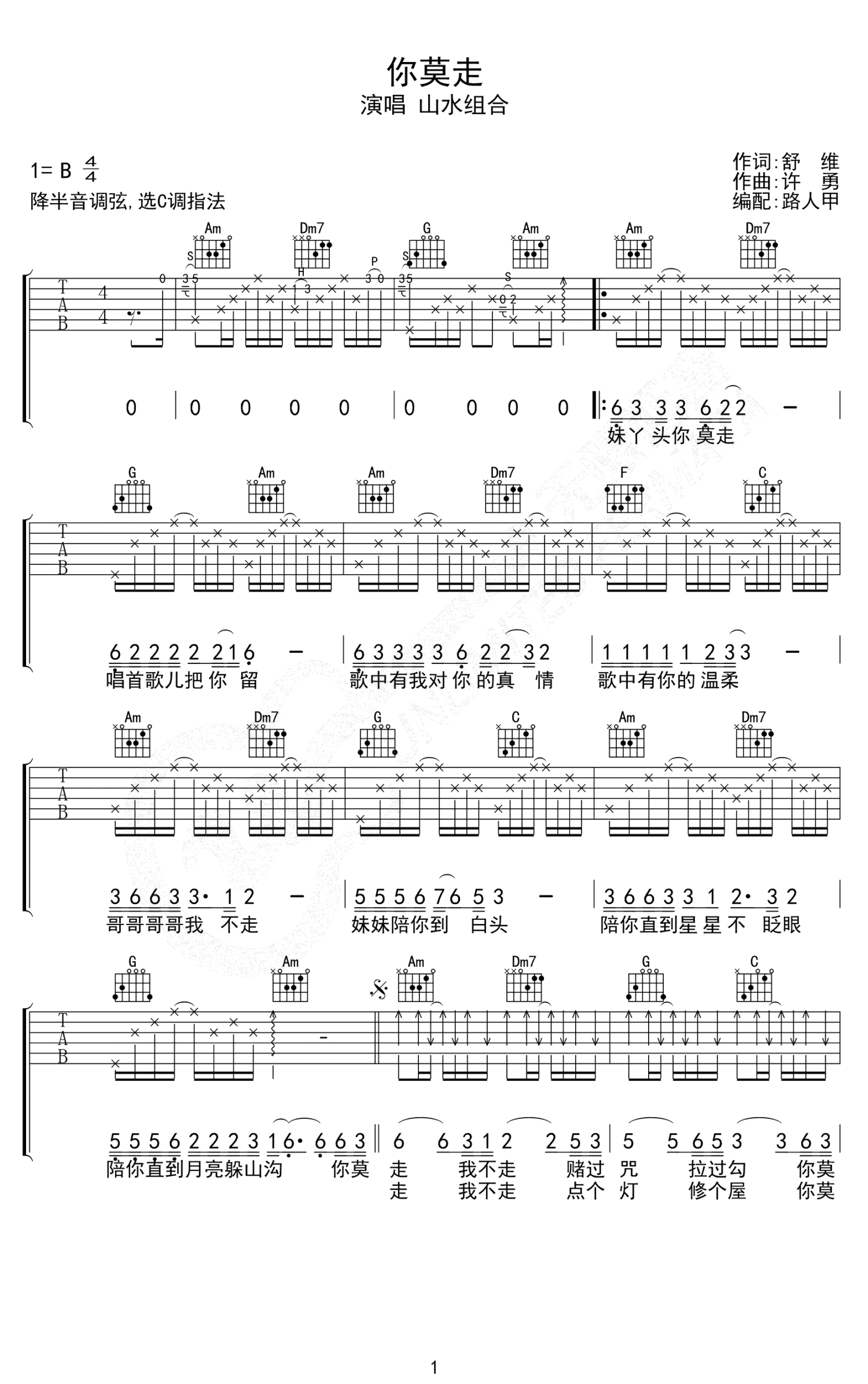 你莫走吉他谱 - 山水组合 - C调吉他弹唱谱