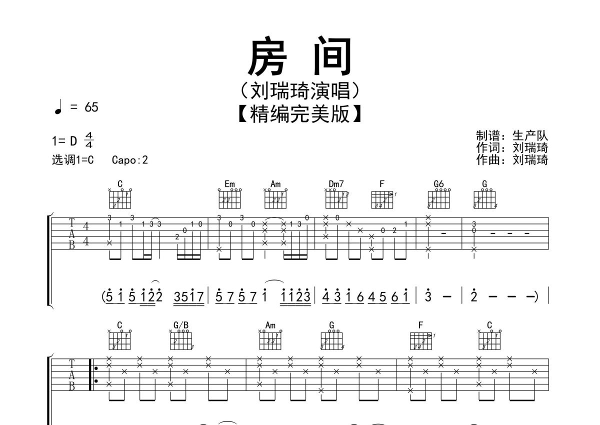曲谱介绍: 刘瑞琦《房间》吉他弹唱谱,采用C调指法编配精编完美版,生产队编配出品,共有3张高清图谱。