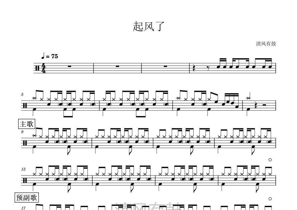 曲谱介绍: 买辣椒也用券《起风了》架子鼓谱,清风有鼓编配出品,共有3张高清图谱。
