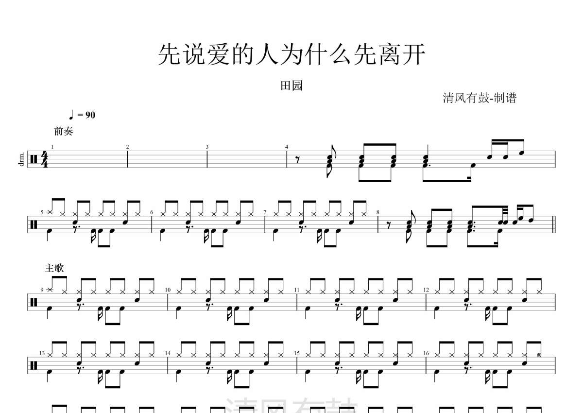 曲谱介绍: 田园《先说爱的人先离开》架子鼓谱,清风有鼓编配出品,共有2张高清图谱,免翻页排版设计。