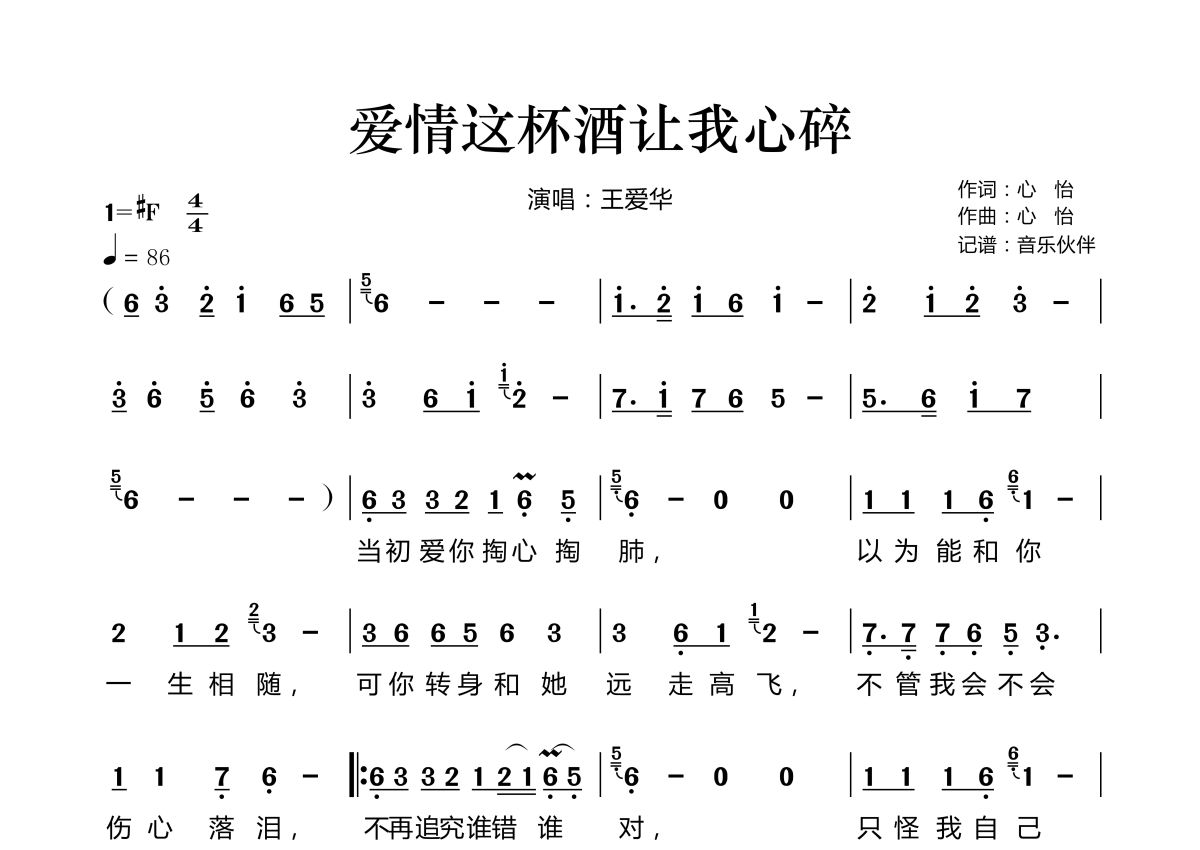 曲谱介绍: 王爱华《爱情这杯酒让我心碎》,音乐伙伴编配出品,共有2张高清图谱,免翻页排版设计。