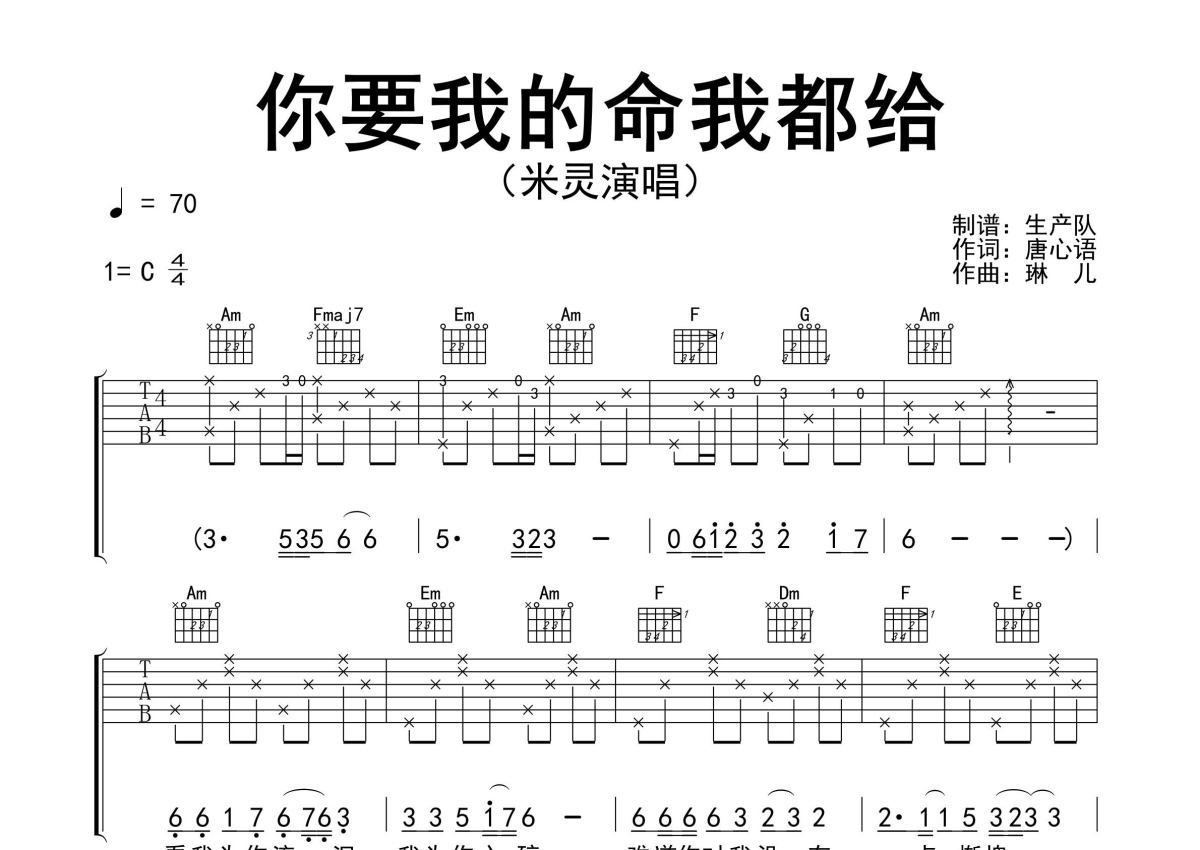曲谱介绍: 米灵《你要我的命我都给》吉他弹唱谱,采用C调指法编配精编完美版,生产队编配出品,共有3张高清图谱。