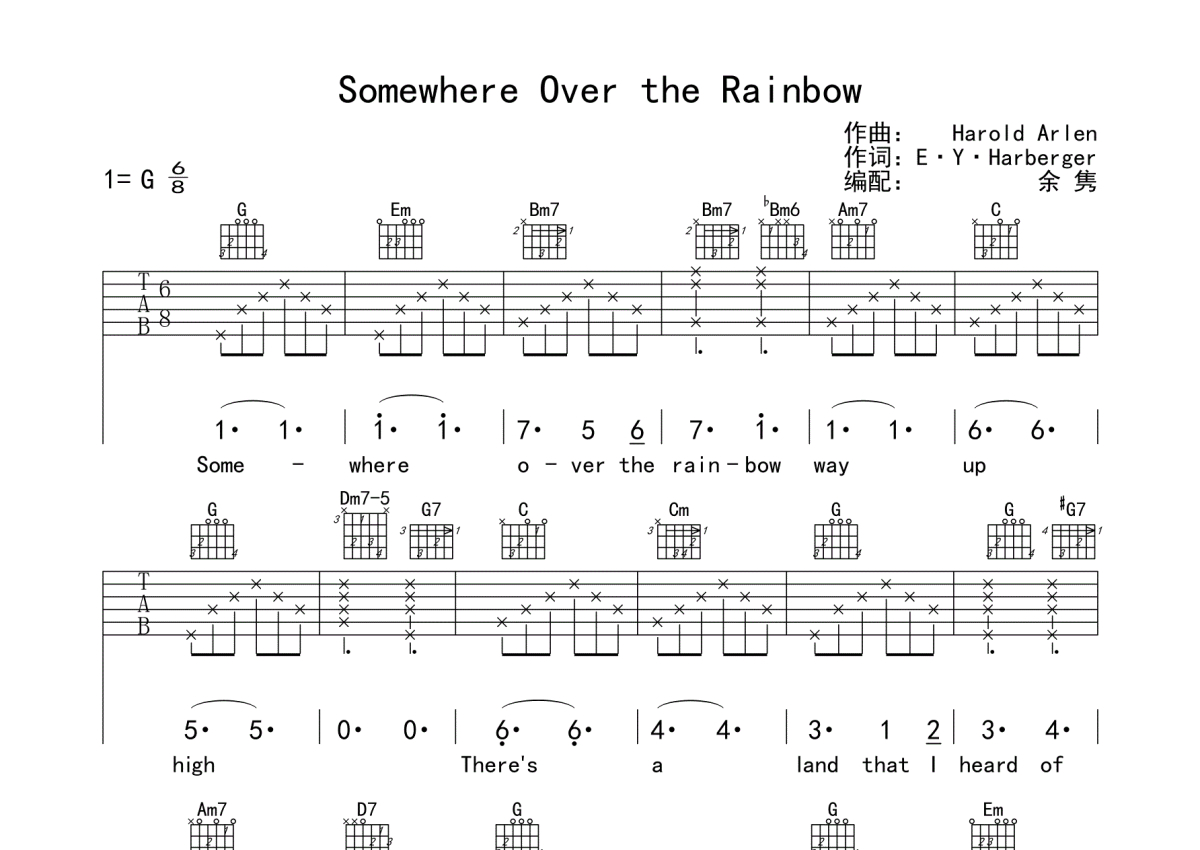 曲谱介绍: JudyGarland《Somewhereovertherainbow》吉他弹唱谱,采用G调指法编配,蘑菇编配出品,共有2张高清图谱,免翻页排版设计。