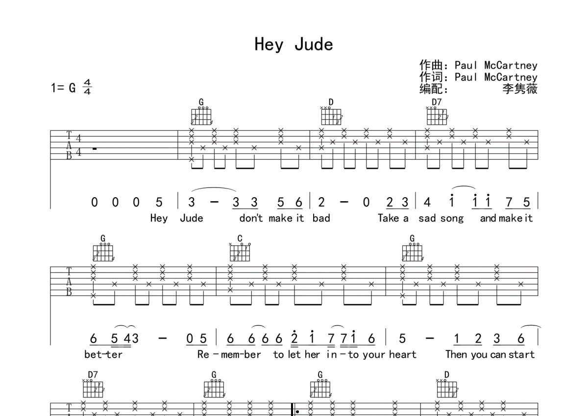 曲谱介绍: TheBeatles《HeyJude》吉他弹唱谱,采用G调指法编配,蘑菇编配出品,共有2张高清图谱,免翻页排版设计。