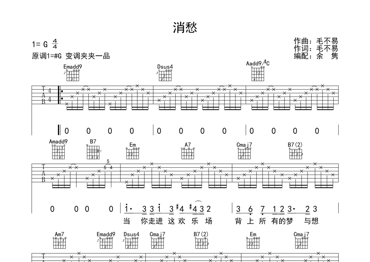 曲谱介绍: 毛不易《消愁》吉他弹唱谱,采用G调指法编配,蘑菇编配出品,共有2张高清图谱,免翻页排版设计。
