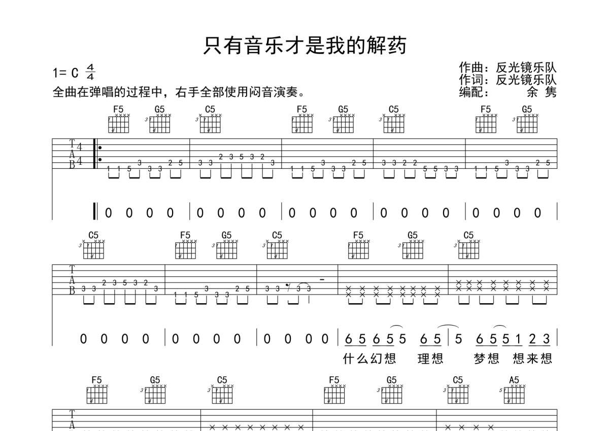 • 只有音乐才是我的解药吉他谱 - 反光镜乐队 - C调吉他弹唱谱第1张