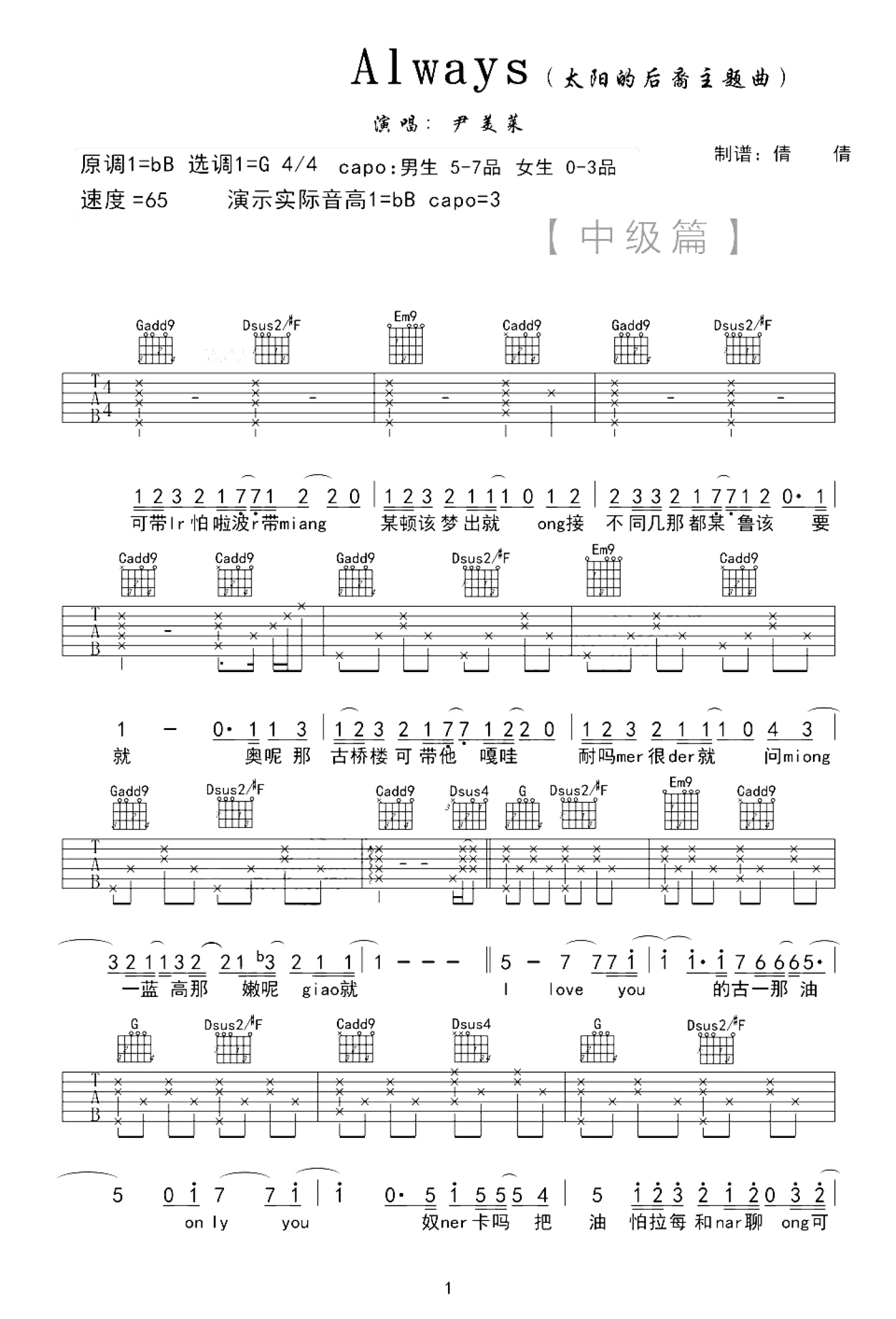 曲谱介绍: 太阳的后裔主题曲,尹美莱演唱的Always吉他谱,原调bB,选调G,男生变调夹5-7品,女生0-3品, 歌曲弹唱结合有一定难度,在演唱中有很多重拍前移的段落