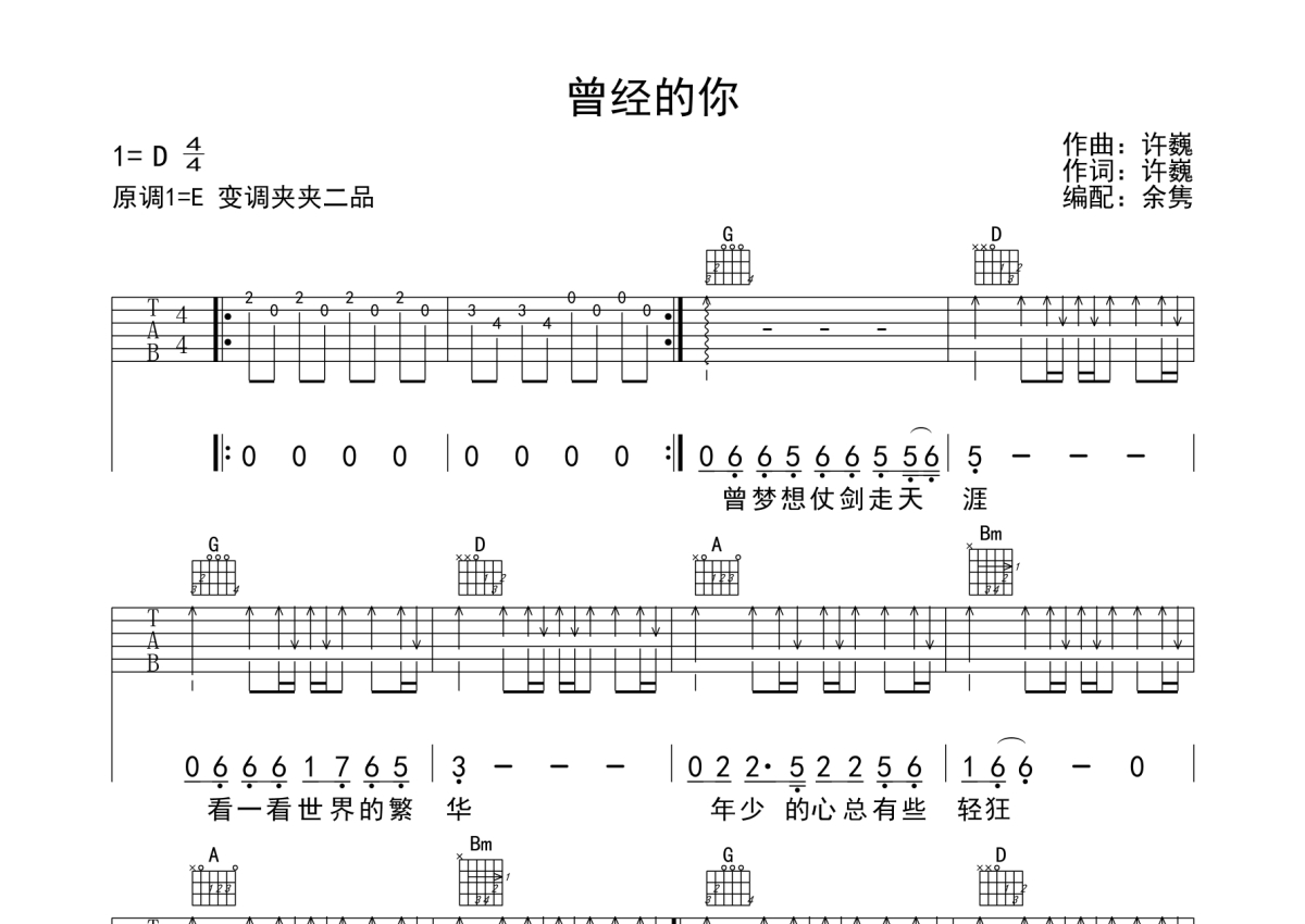 • 曾经的你吉他谱 - 许巍 - D调吉他弹唱谱第1张