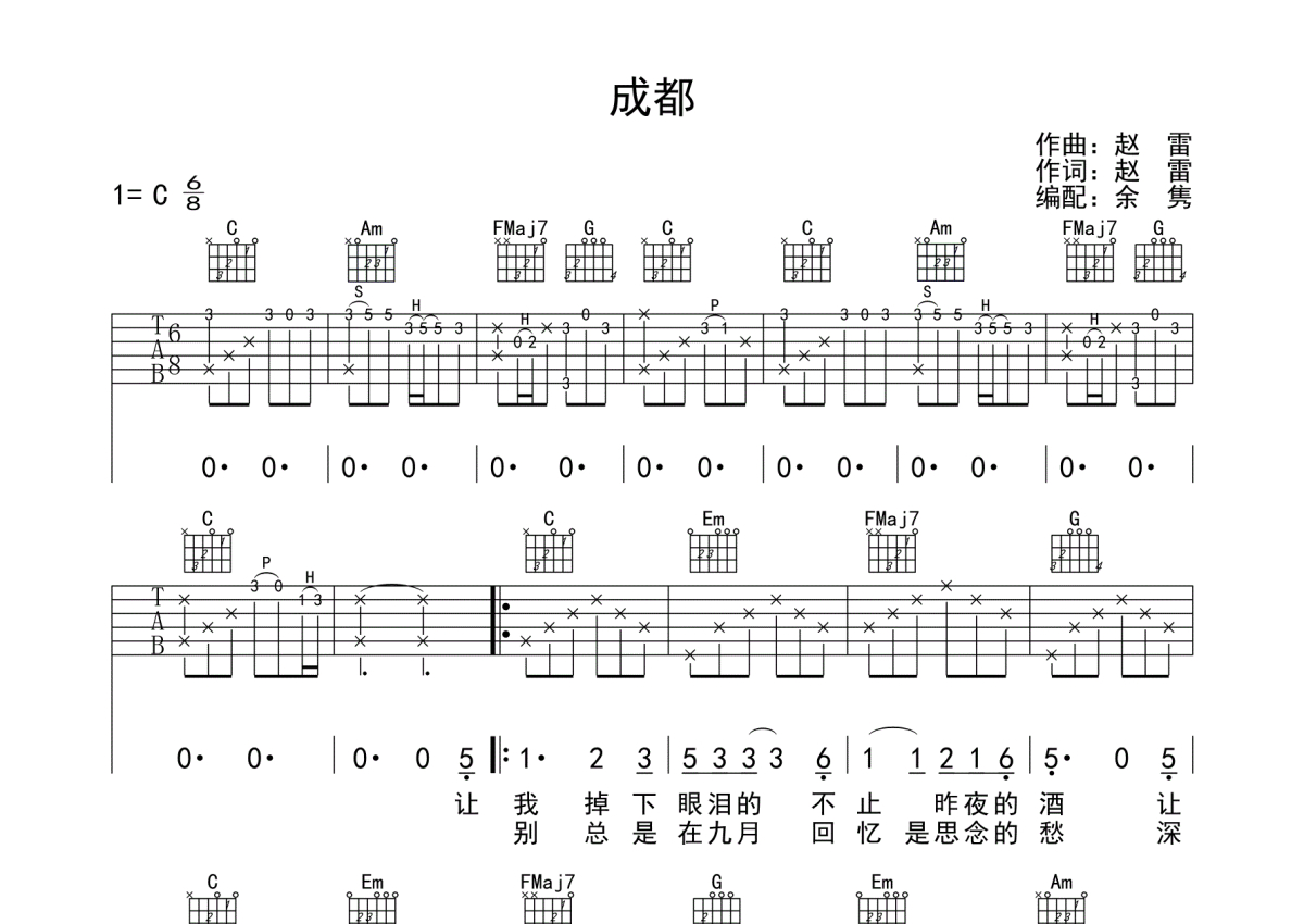 曲谱介绍: 赵雷《成都》吉他弹唱谱,采用C调指法编配,蘑菇编配出品,共有2张高清图谱,免翻页排版设计。