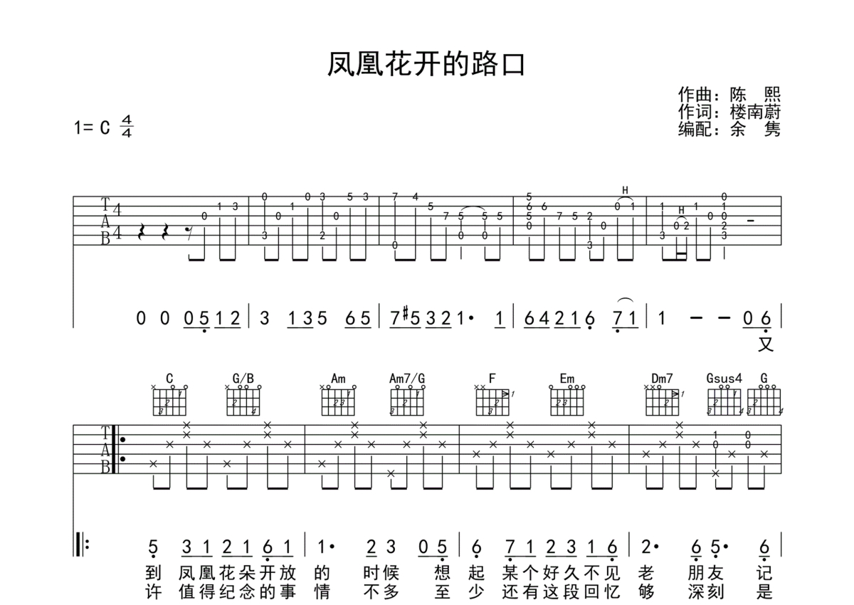 曲谱介绍: 林志炫《凤凰花开的路口》吉他弹唱谱,采用C调指法编配,蘑菇编配出品,共有2张高清图谱,免翻页排版设计。