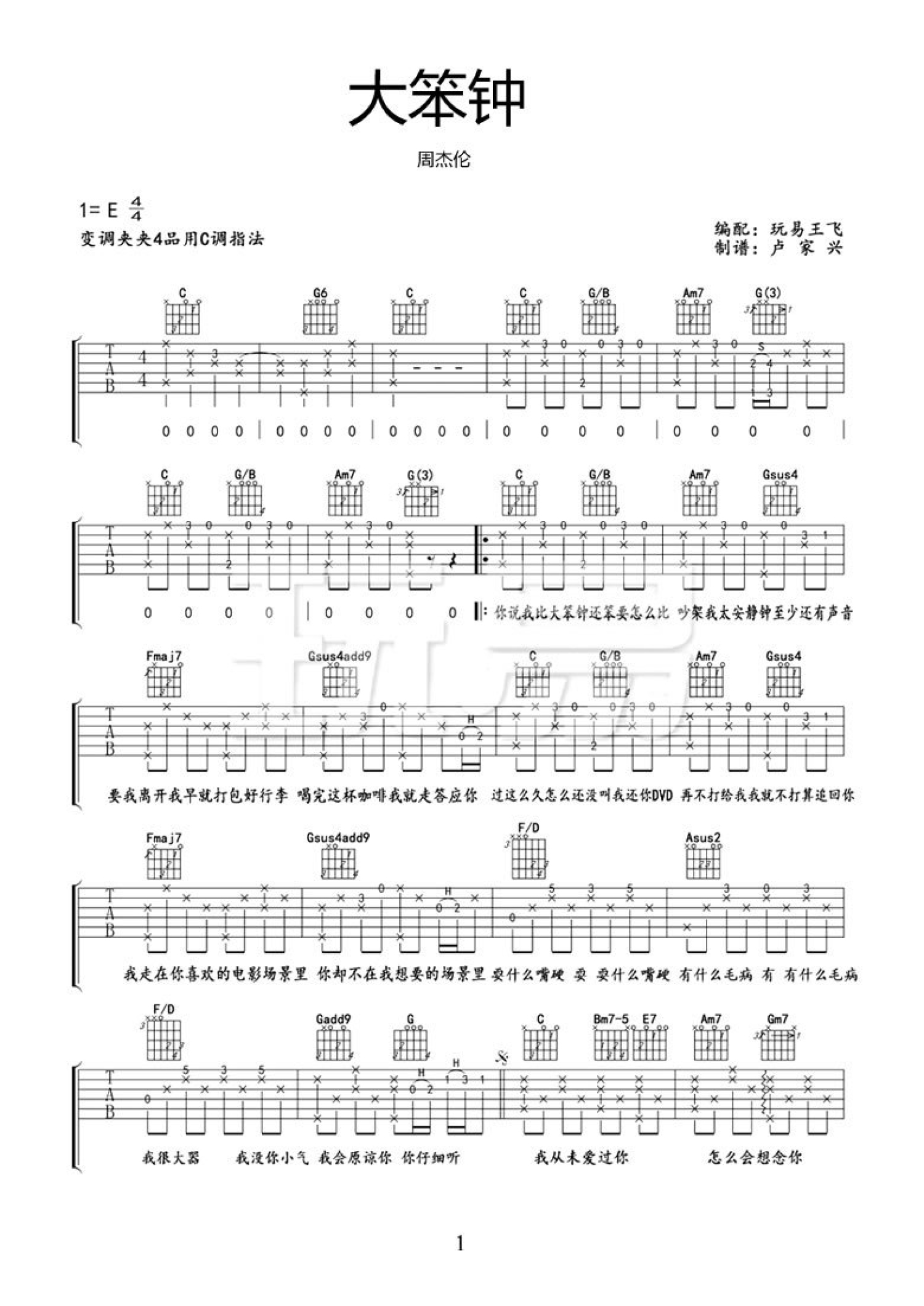 曲谱介绍: 大笨钟吉他谱>周杰伦大笨钟吉他六线谱,原调E,使用变调夹夹4品用C调指法。大笨钟是一首轻快浪漫的抒情情歌,收录于周杰伦的专辑《十二新作》中。网上女声版刘瑞琦的翻唱很有特色,受到大家的喜欢。