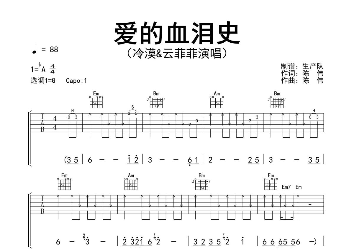 曲谱介绍: 冷漠&云菲菲《爱的血泪史》吉他弹唱谱,采用G调指法编配精编完美版,生产队编配出品,共有3张高清图谱。