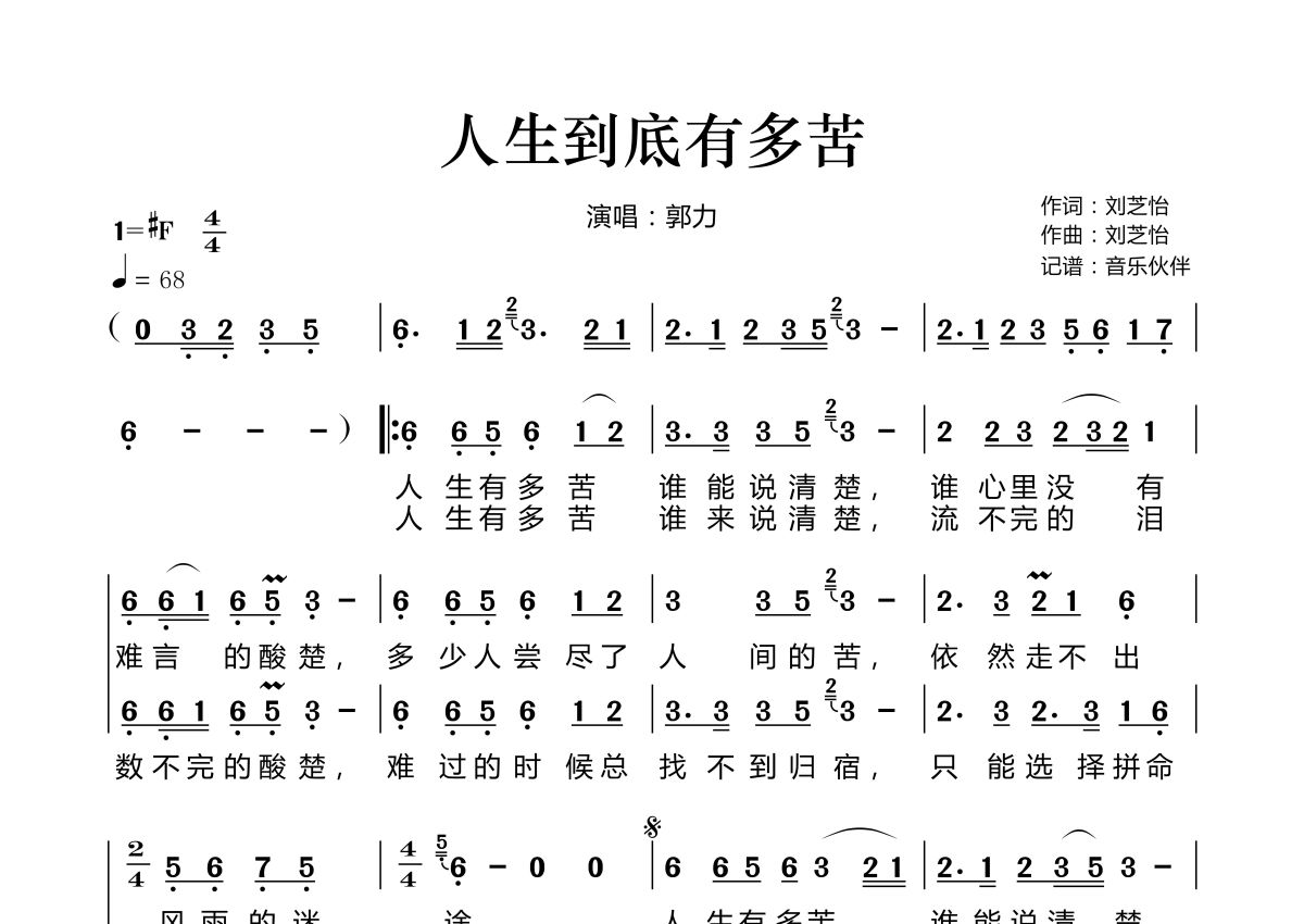 曲谱介绍: 郭力《人生到底有多苦》,音乐伙伴编配出品,共有2张高清图谱,免翻页排版设计。