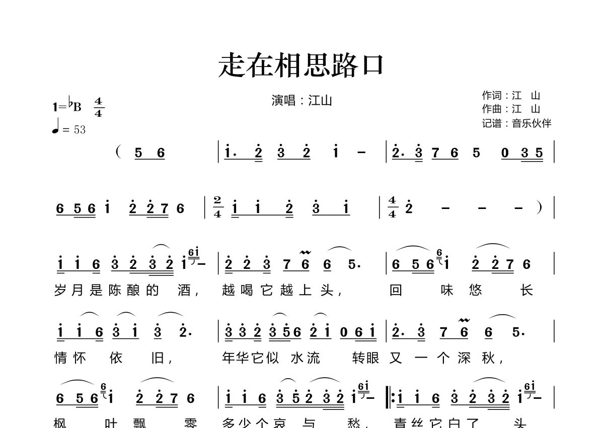 曲谱介绍: 江山《走在相思路口》,音乐伙伴编配出品,共有2张高清图谱,免翻页排版设计。