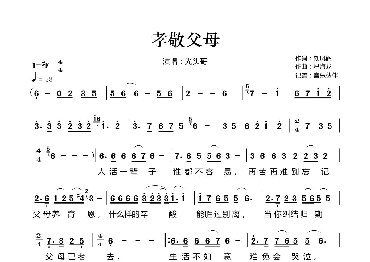 曲谱介绍: 光头哥《孝敬父母》,音乐伙伴编配出品,共有2张高清图谱,免翻页排版设计。