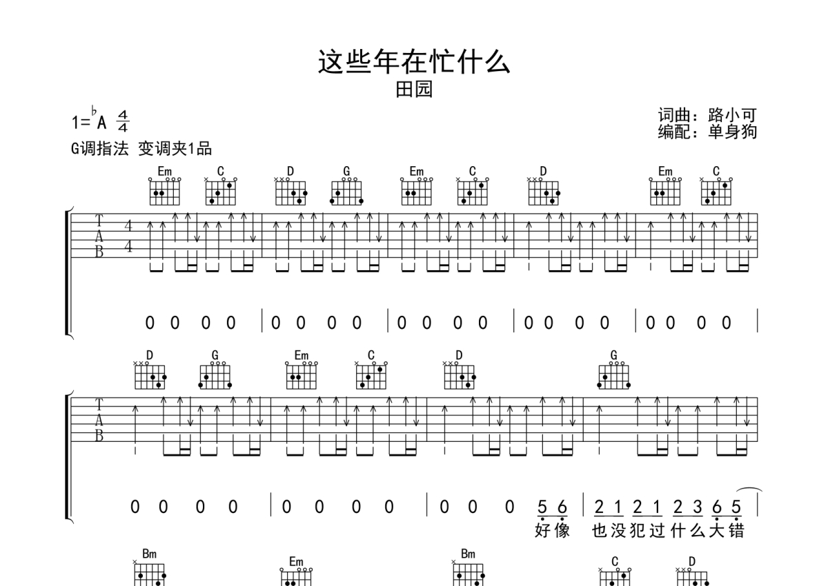 曲谱介绍: 田园《这些年在忙什么》吉他弹唱谱,采用G调指法编配,单身狗编配出品,共有3张高清图谱。