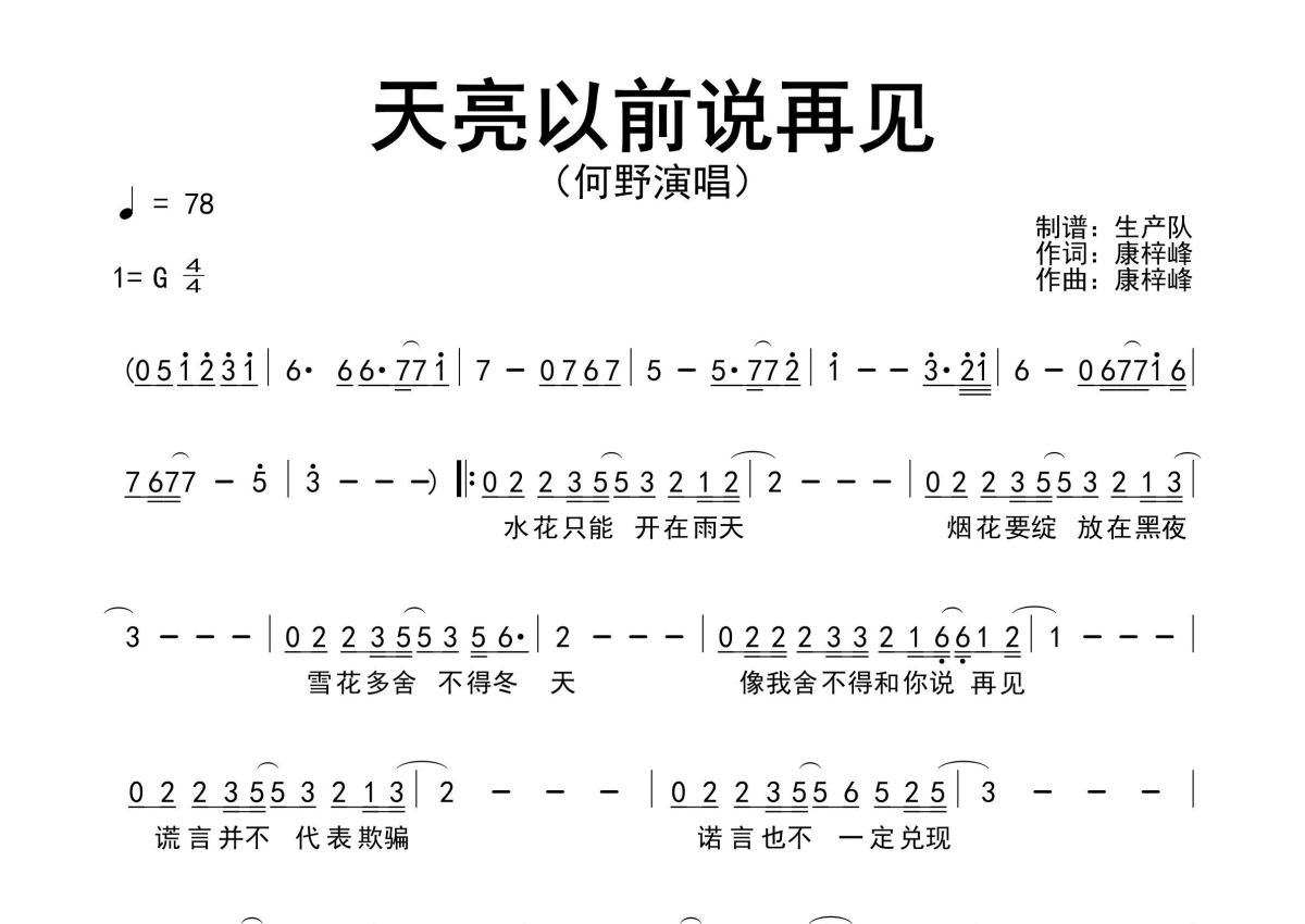 曲谱介绍: 何野《天亮以前说再见》原版简谱,生产队编配出品,共有1张高清图谱,免翻页排版设计。