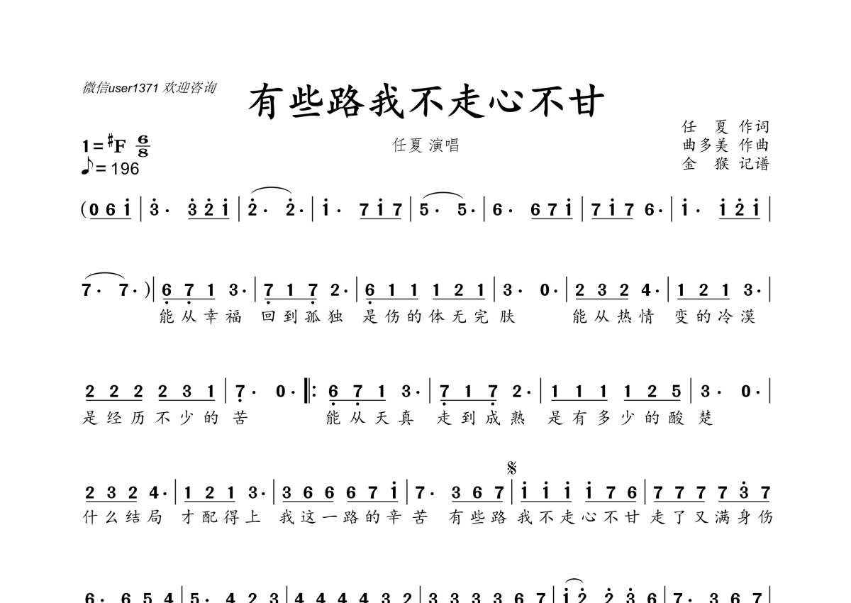 曲谱介绍: 任夏《有些路我不走心不甘》,金猴奋起千钧棒编配出品,共有1张高清图谱,免翻页排版设计。