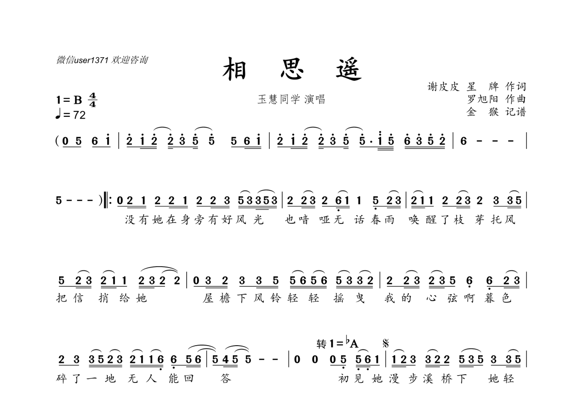 曲谱介绍: 玉慧同学《相思谣》,金猴奋起千钧棒编配出品,共有1张高清图谱,免翻页排版设计。