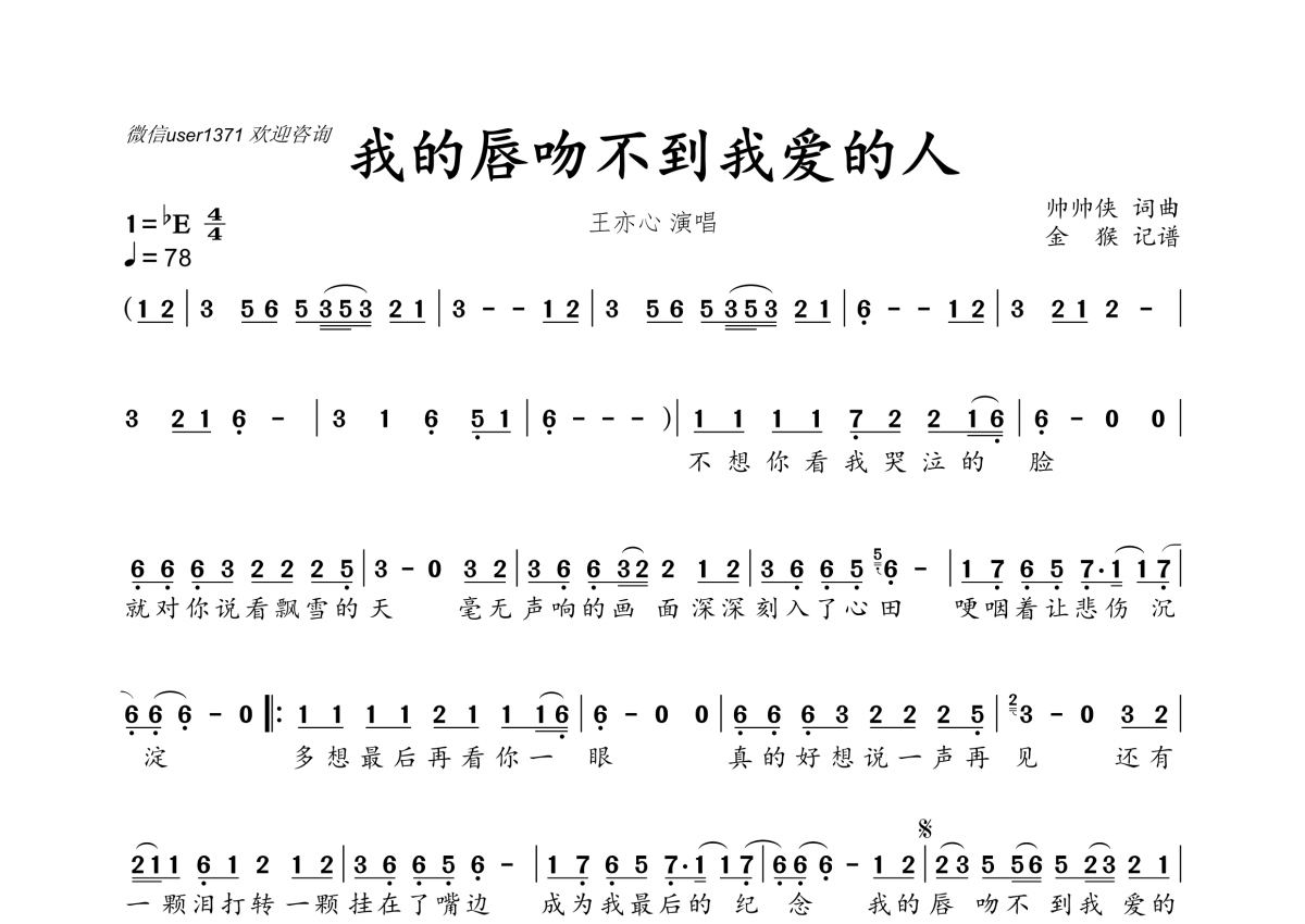 • 我的唇吻不到我爱的人简谱 - 王亦心第1张