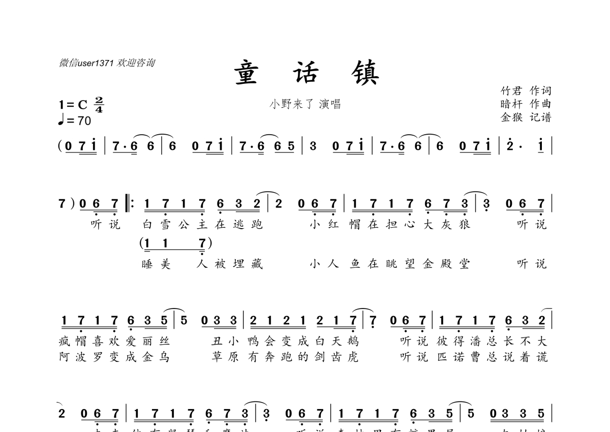 曲谱介绍: 小野来了《童话镇》,金猴奋起千钧棒编配出品,共有2张高清图谱,免翻页排版设计。