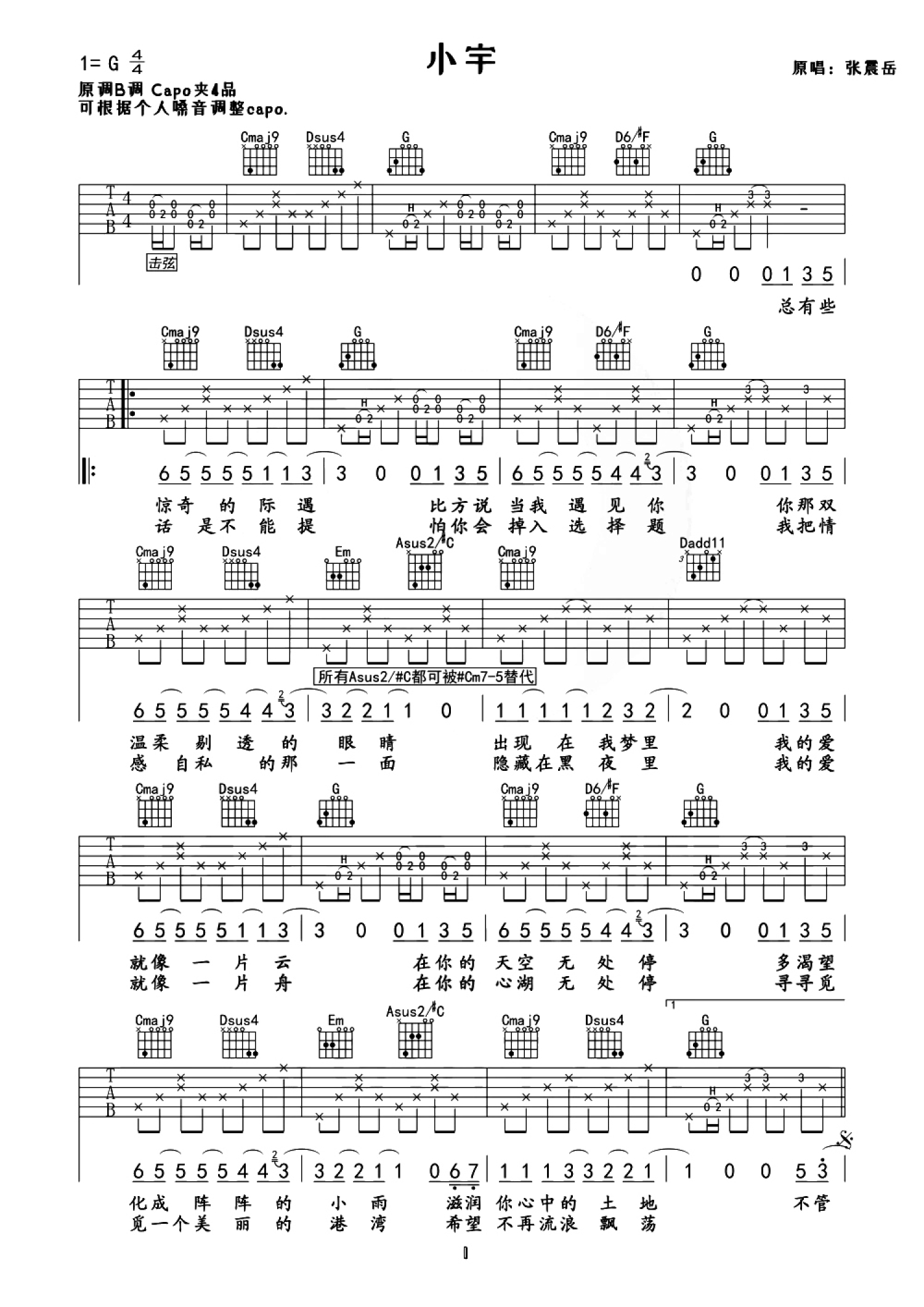 曲谱介绍: 张震岳《小宇》吉他谱_G调吉他弹唱谱
