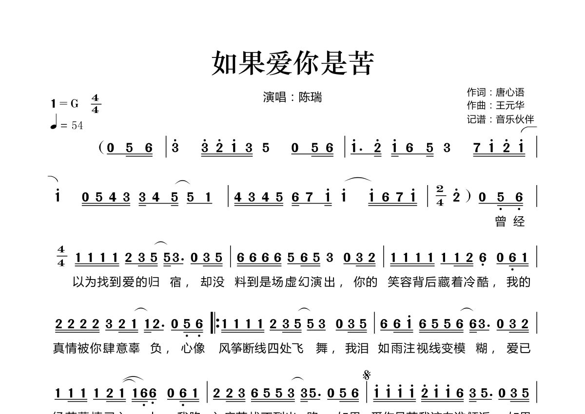 曲谱介绍: 陈瑞《如果爱你是苦》,音乐伙伴编配出品,共有1张高清图谱,免翻页排版设计。