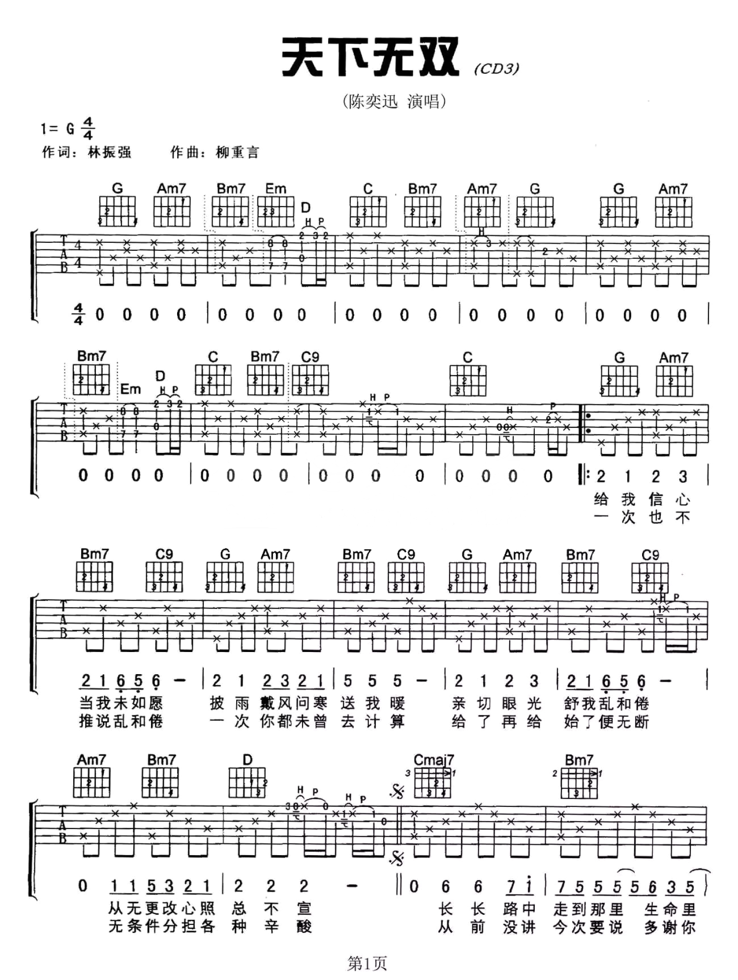 曲谱介绍: 陈奕迅《天下无双》吉他谱_C调吉他弹唱谱