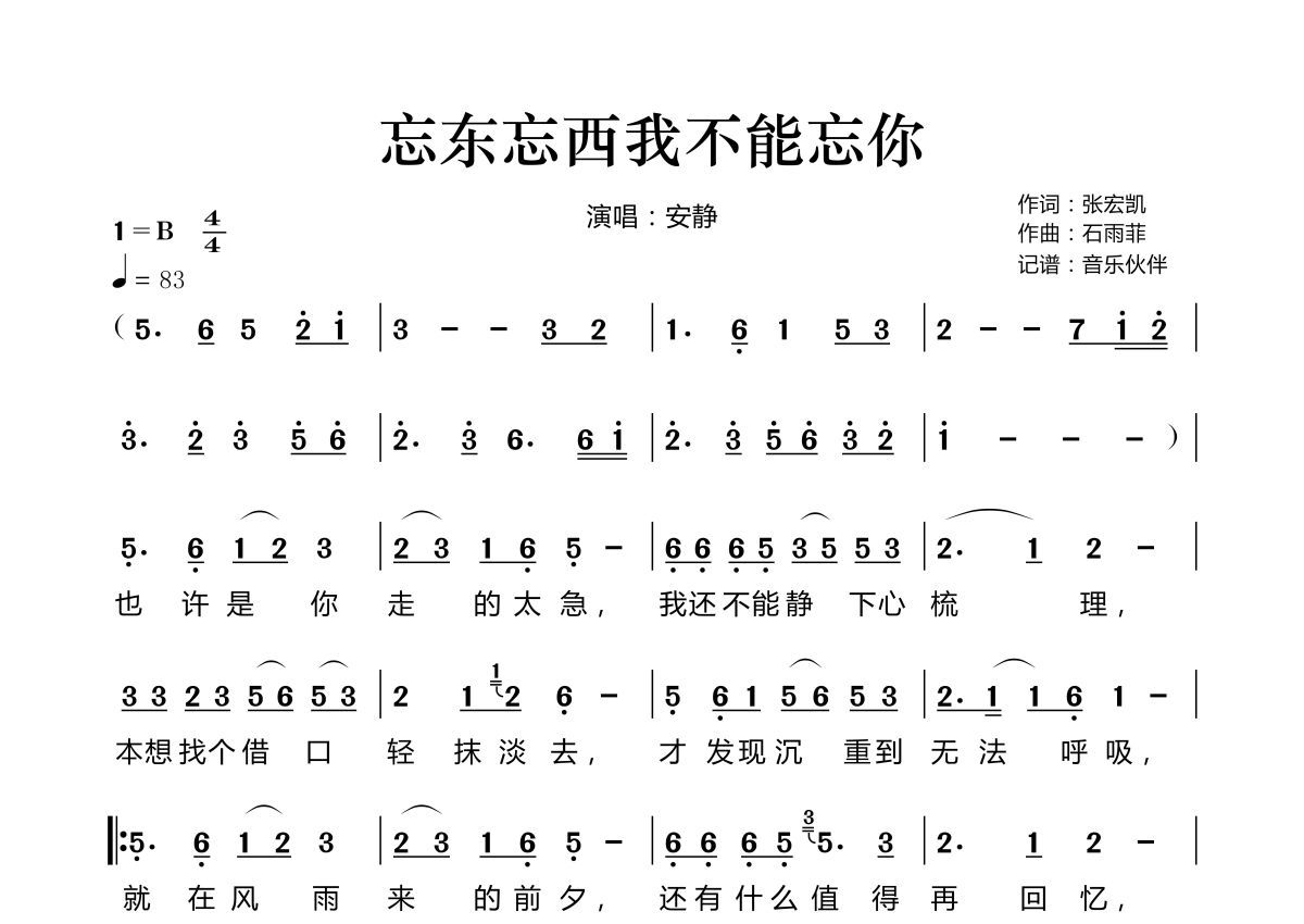 曲谱介绍: 安静《忘东忘西我不能忘你》,音乐伙伴编配出品,共有2张高清图谱,免翻页排版设计。