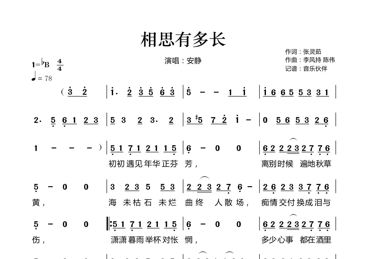 曲谱介绍: 安静《相思有多长》,音乐伙伴编配出品,共有2张高清图谱,免翻页排版设计。