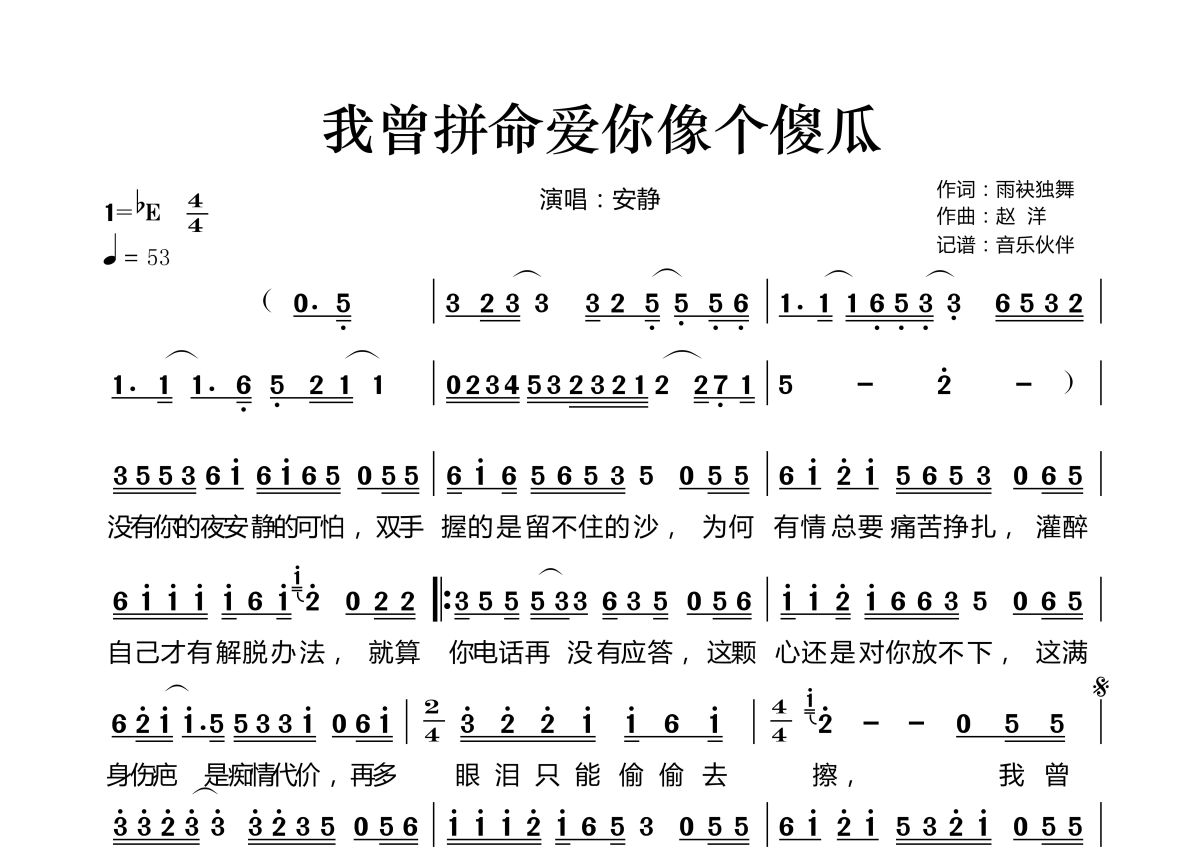 曲谱介绍: 安静《我曾拼命爱你像个傻瓜》,音乐伙伴编配出品,共有1张高清图谱,免翻页排版设计。