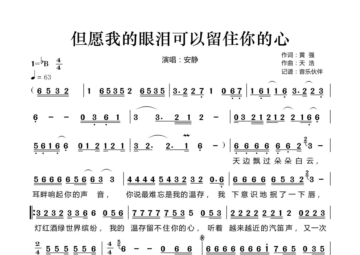 曲谱介绍: 安静《但愿我的眼泪可以留住你的心》,音乐伙伴编配出品,共有1张高清图谱,免翻页排版设计。