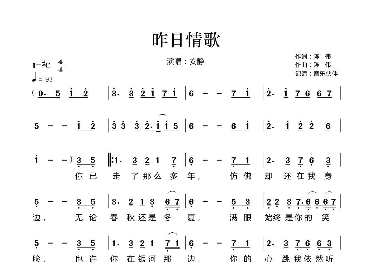 曲谱介绍: 安静《昨日情歌》,音乐伙伴编配出品,共有2张高清图谱,免翻页排版设计。