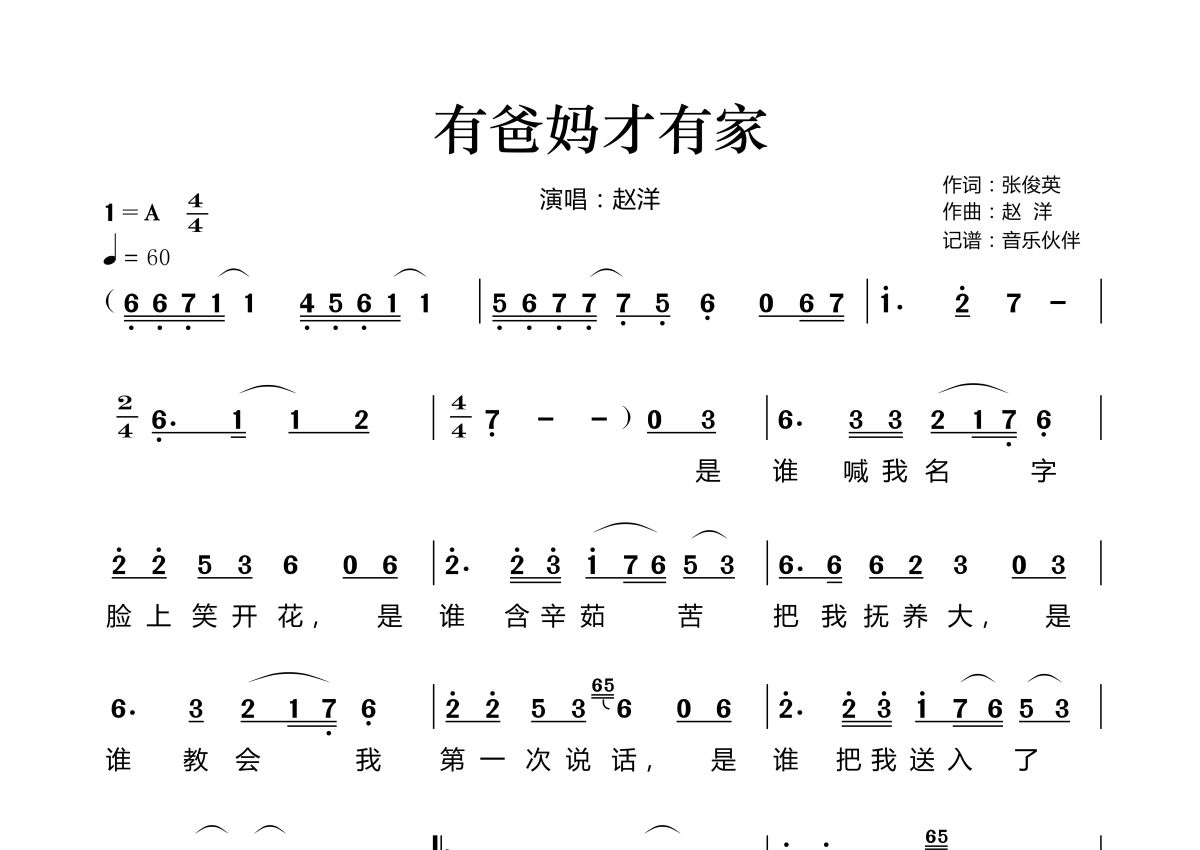 曲谱介绍: 赵洋《有爸妈才有家》,音乐伙伴编配出品,共有2张高清图谱,免翻页排版设计。