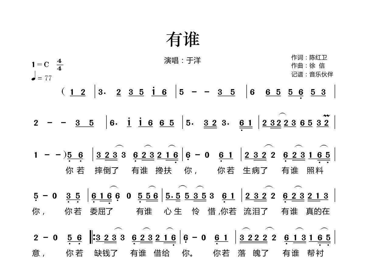 曲谱介绍: 于洋《有谁》,音乐伙伴编配出品,共有2张高清图谱,免翻页排版设计。